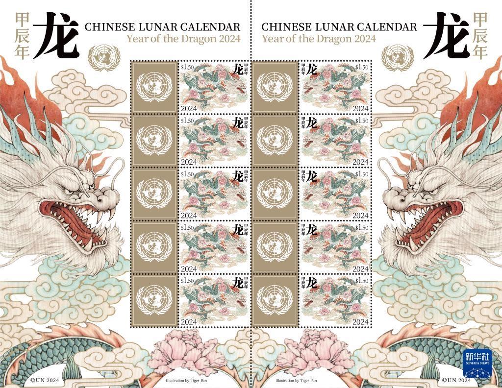联合国邮政管理局将于1月19日在纽约发行中国农历甲辰年特别版邮票版张——龙票版张,庆祝中国农历新年的到来。这是该邮票版张样图。新华社发(联合国邮政管理局供图)