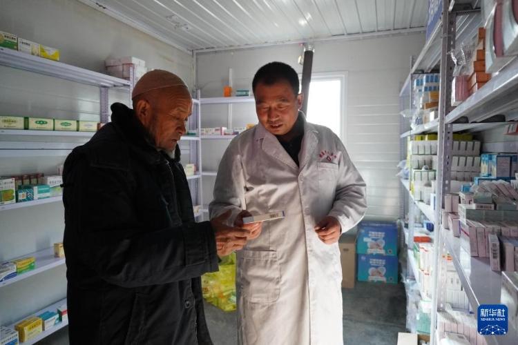 1月16日,甘肃省临夏州积石山县刘集乡阳洼村的群众在安置点的医务室里取药。