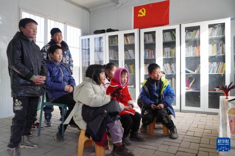 1月16日,在甘肃省临夏州积石山县刘集乡阳洼村安置点,小朋友们在阅览室内观看影片。