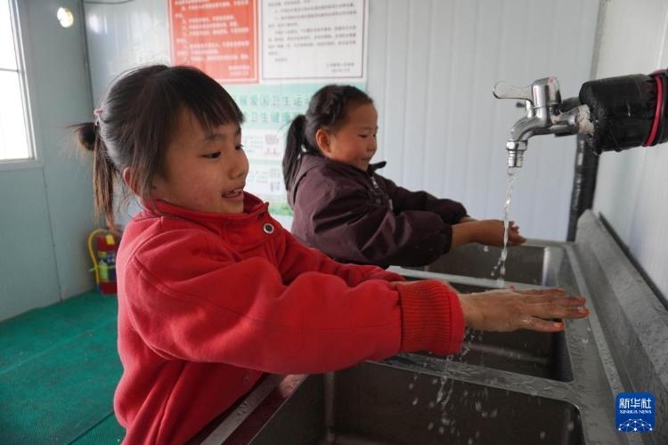 1月16日,在甘肃省临夏州积石山县大河家镇陈家村安置点,小朋友在水房洗手。