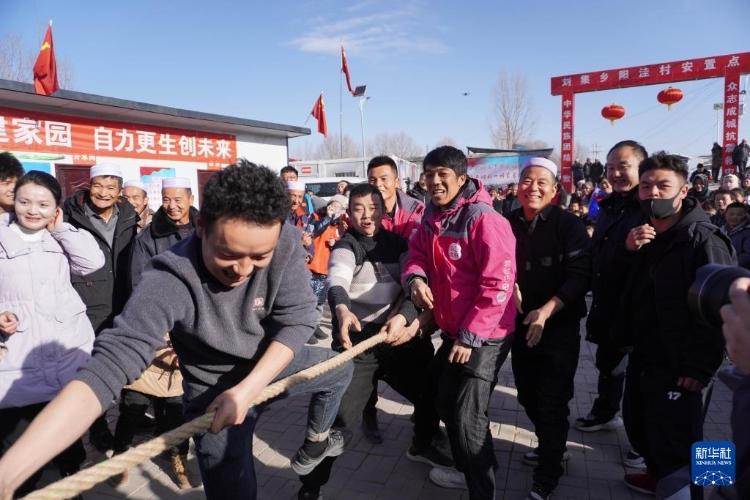 1月16日,在甘肃省临夏州积石山县刘集乡阳洼村安置点,群众在趣味运动会上进行拔河比赛。