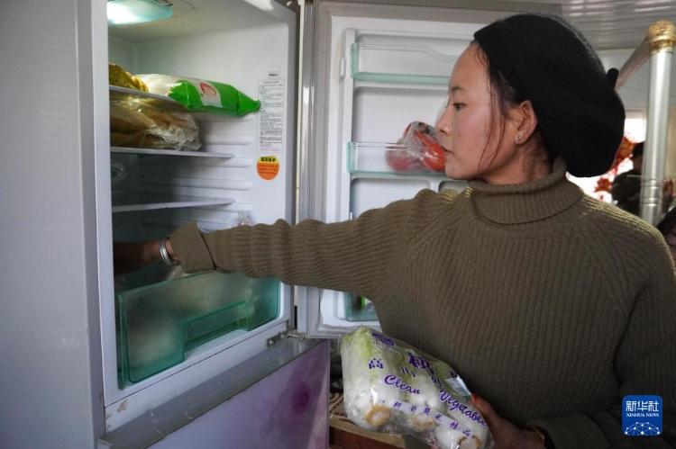 1月16日,在甘肃省临夏州积石山县刘集乡阳洼村安置点的板房内,群众从冰箱内拿取蔬菜准备做饭。