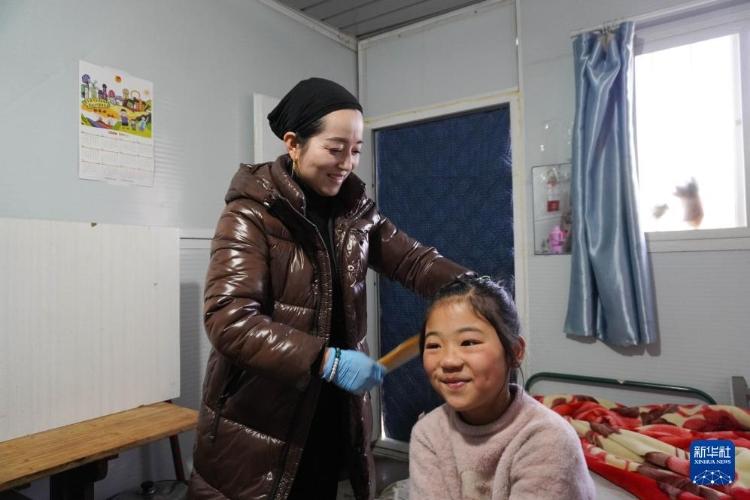 1月16日,在甘肃省临夏州积石山县刘集乡阳洼村安置点的板房内,群众为孩子梳头发。