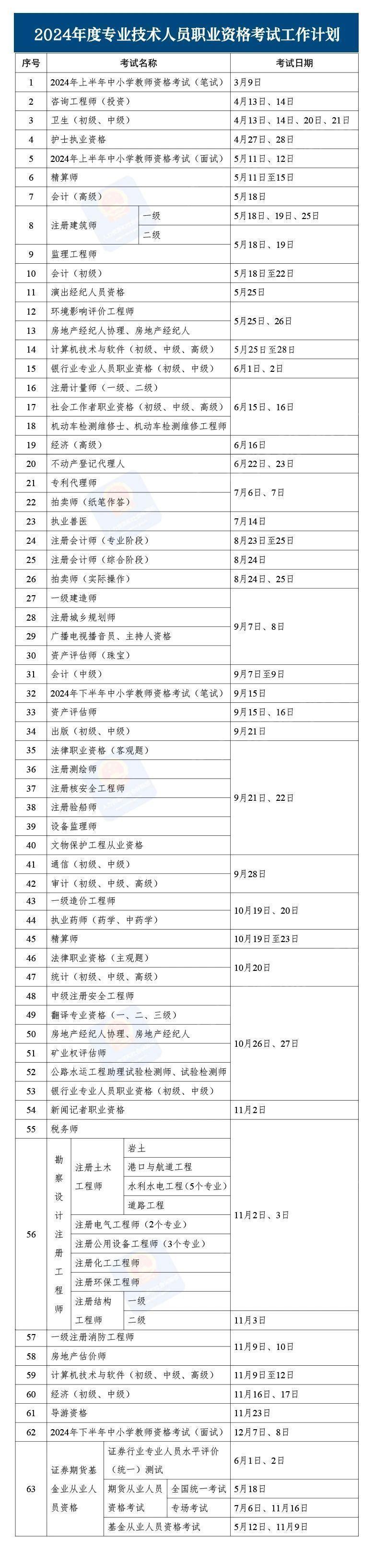 近日,人力资源社会保障部办公厅印发《关于2024年度专业技术人员职业资格考试工作计划及有关事项的通知》。