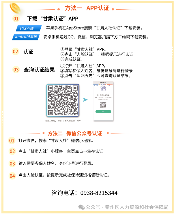 2.现场认证。自主认证不成功的、使用智能手机有困难的人员可携带身份证到就近的街道(社区)或秦州区人社局一楼服务大厅(南明路梧林苑4号)5号窗口进行现场认证。