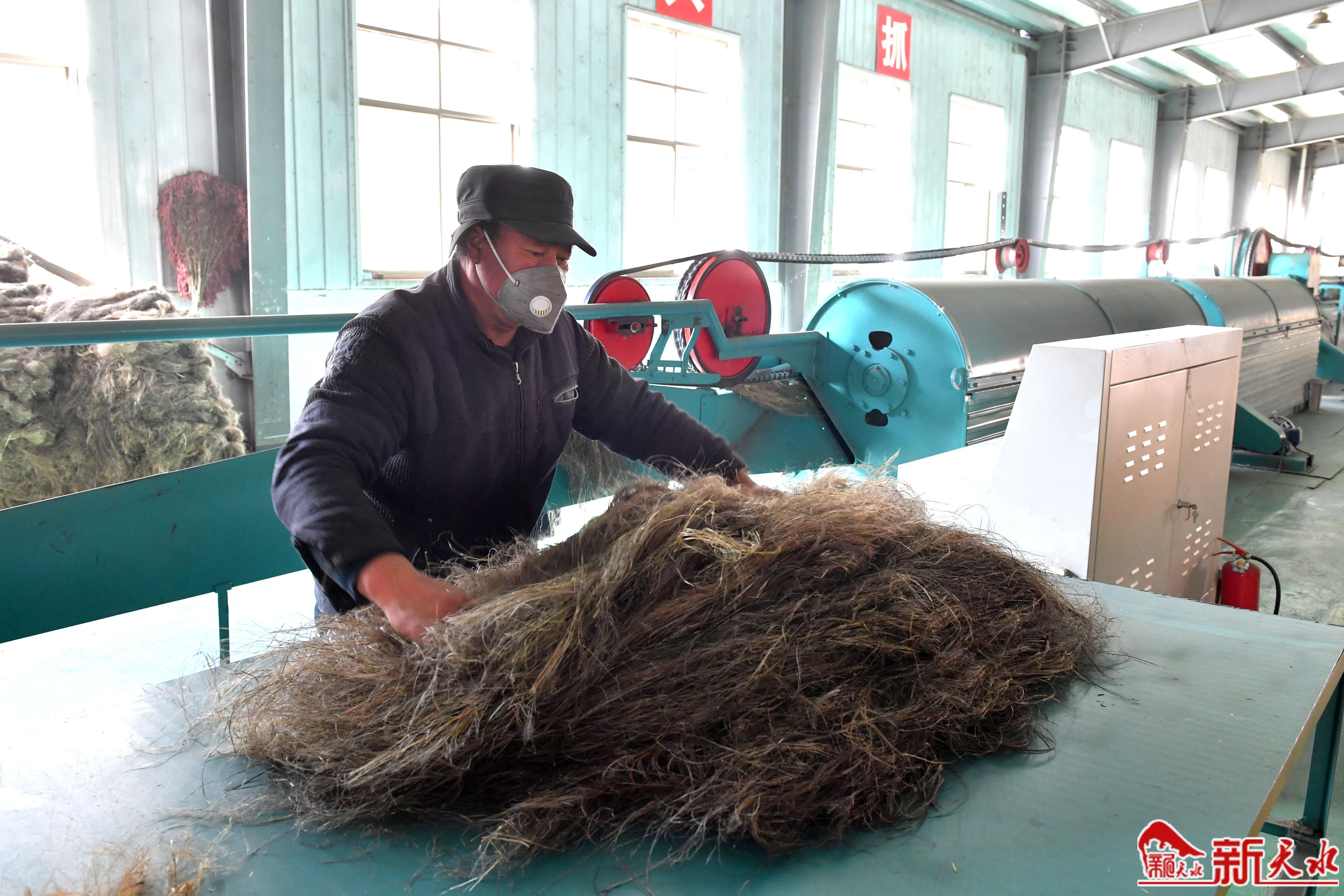 采访中,记者在甘肃盛裕达汉麻产业有限责任公司的生产加工车间里看到,随着机器轰轰作响,1条打麻生产线高速运转,一缕缕麻纤维从生产线上滚滚而出,工人运麻、梳麻、捆麻、打包、转储,环环相接,井然有序……