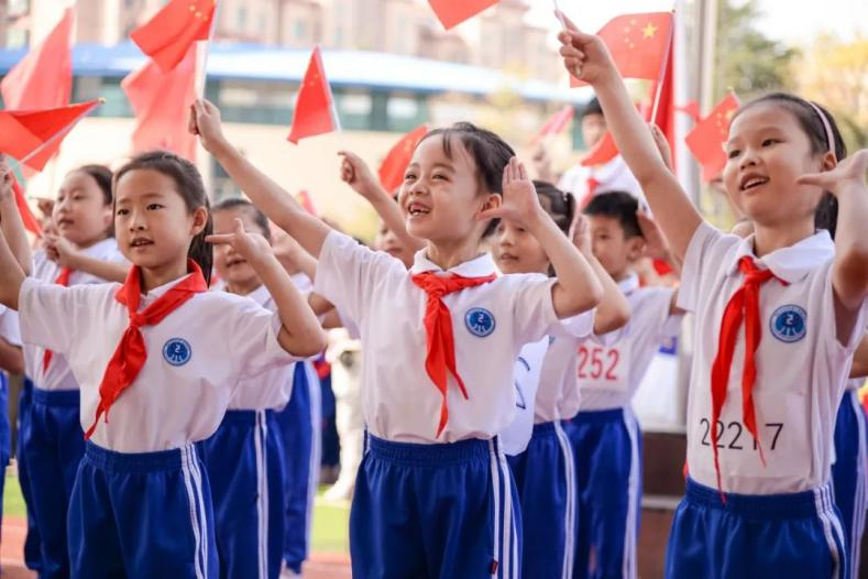 2023年10月12日,在山东省青岛市城阳区第二实验小学,学生们在秋季运动会开幕式上进行才艺展演。通讯员 张鹰 摄