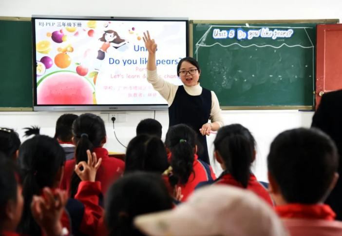 2023年4月13日,在贵州省黔西市铁石苗族彝族乡铁石小学,来自广州市增城区中新镇第二小学的老师在上英语公开课。通讯员 熊军万 摄