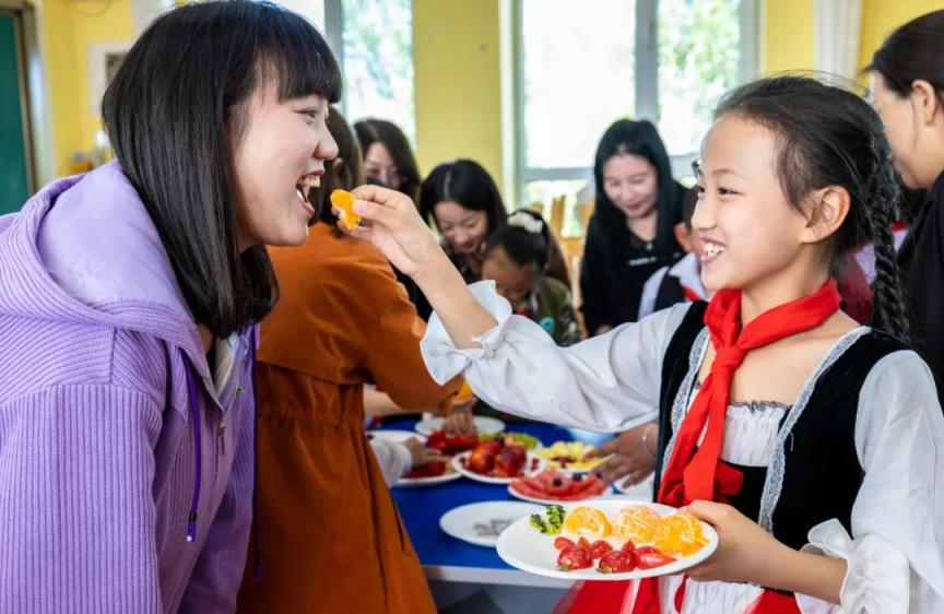 2023年5月12日,呼和浩特市玉泉区五塔寺东街小学学生请妈妈品尝自己刚刚拼好的水果拼盘。通讯员 丁根厚 摄