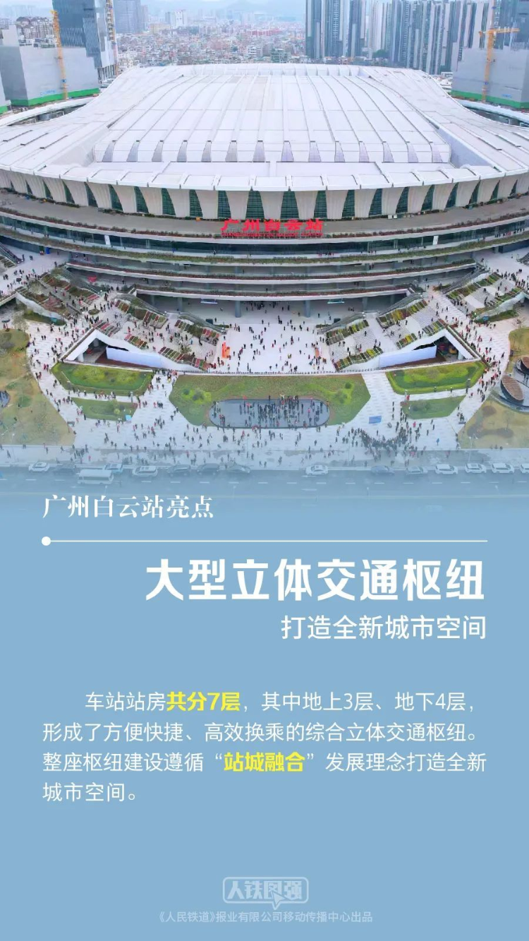 四角进站,八方迎客;站场规模11台24线;地上3层、地下4层;可满足1万多人同时候车……这就是亚洲特大型综合交通枢纽——广州白云站。