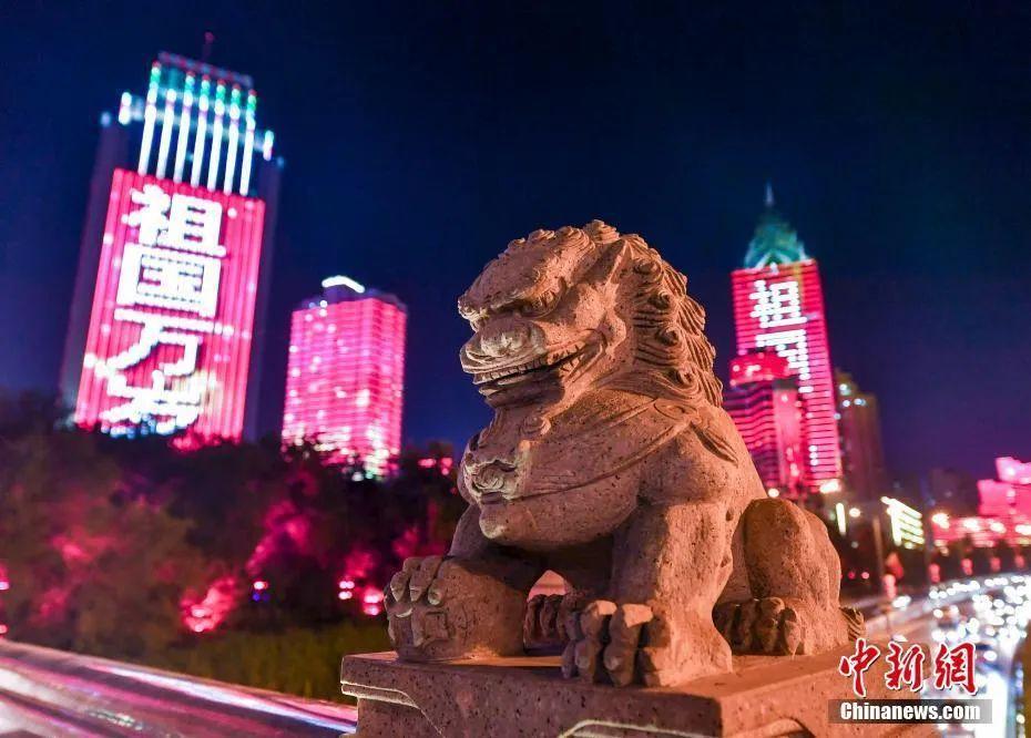 新疆乌鲁木齐市西大桥桥头的石狮子与璀璨灯光秀相互辉映。刘新 摄