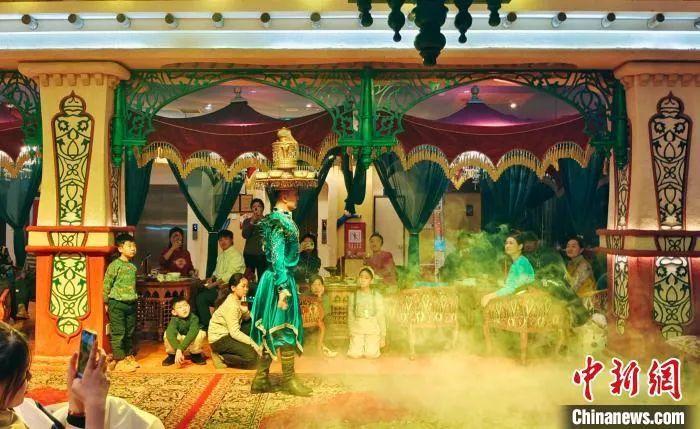 游客在乌鲁木齐宴会厅欣赏民族歌舞。图为“非遗”萨玛瓦尔舞。史玉江 摄