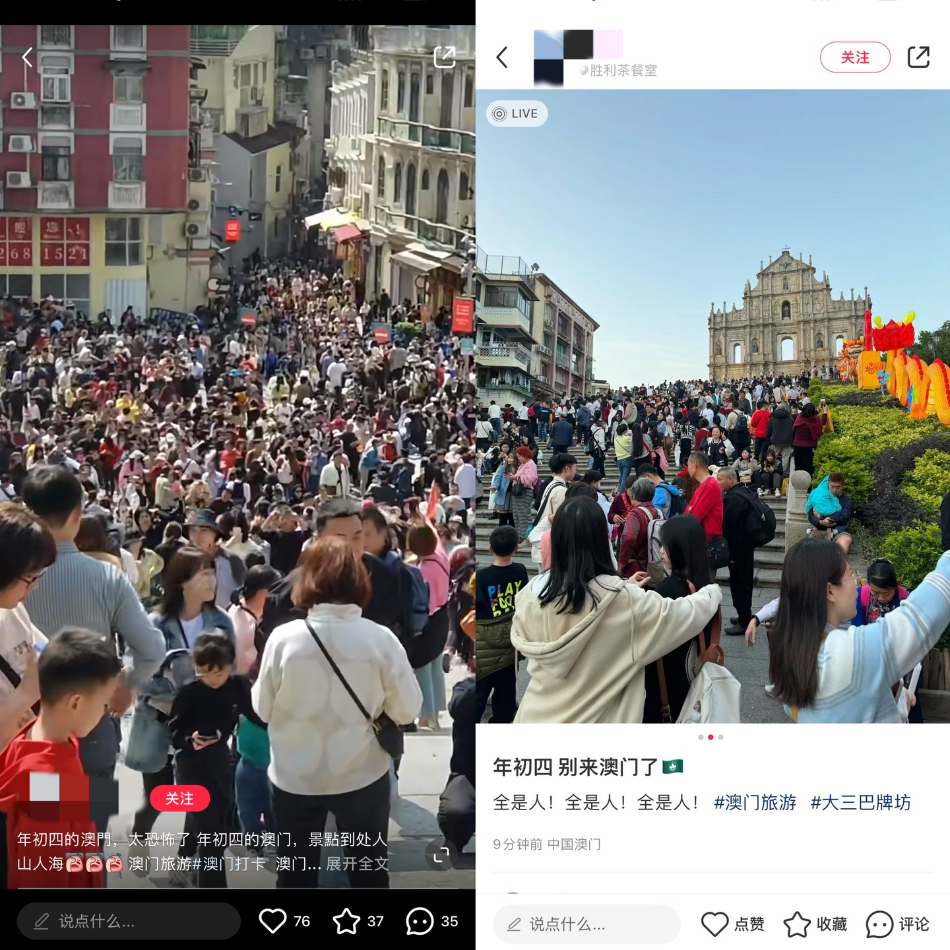 澎湃新闻(www.thepaper.cn)此前报告,不少游客在社交平台发布照片称年初四的澳门“全是人”,直呼“别来了”。而春节期间,澳门热门景点附近不少酒店价格都翻了数倍,其中澳门银河酒店自2月13日至2月20日以及2月24日(元宵节)至2月25日等入住的客房都已售罄。