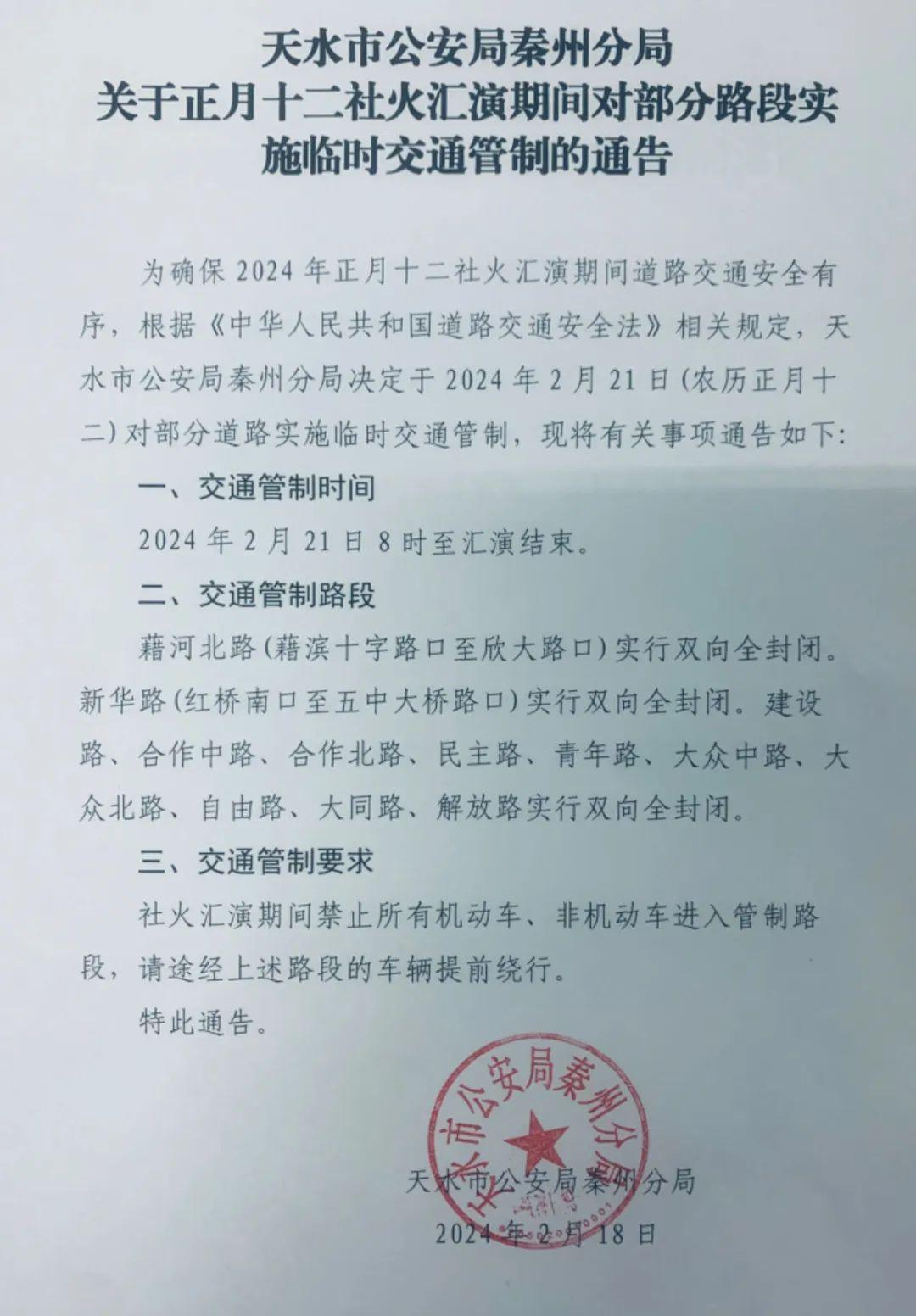 为确保2024年正月十二社火汇演期间道路交通安全有序,根据《中华人民共和国道路交通安全法》相关规定,天水市公安局秦州分局决定于2024年2月21日(农历正月十二)对部分道路实施临时交通管制,现将有关事项通告如下:
