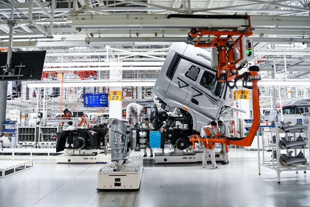 在位于吉林长春的一汽解放汽车有限公司J7智能工厂内,工人在AGV(搬运机器人)上装配车辆(2023年6月12日摄)。新华社记者 颜麟蕴 摄