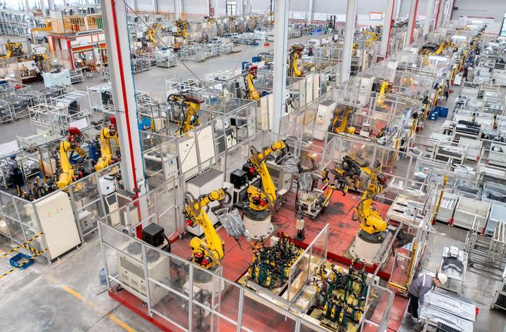 2024年1月8日,在位于浙江省湖州市长兴经济技术开发区的长兴地通汽车部件有限公司,全自动机器人高速运转生产新能源汽车配件订单产品(无人机照片)。新华社发(谭云俸摄)