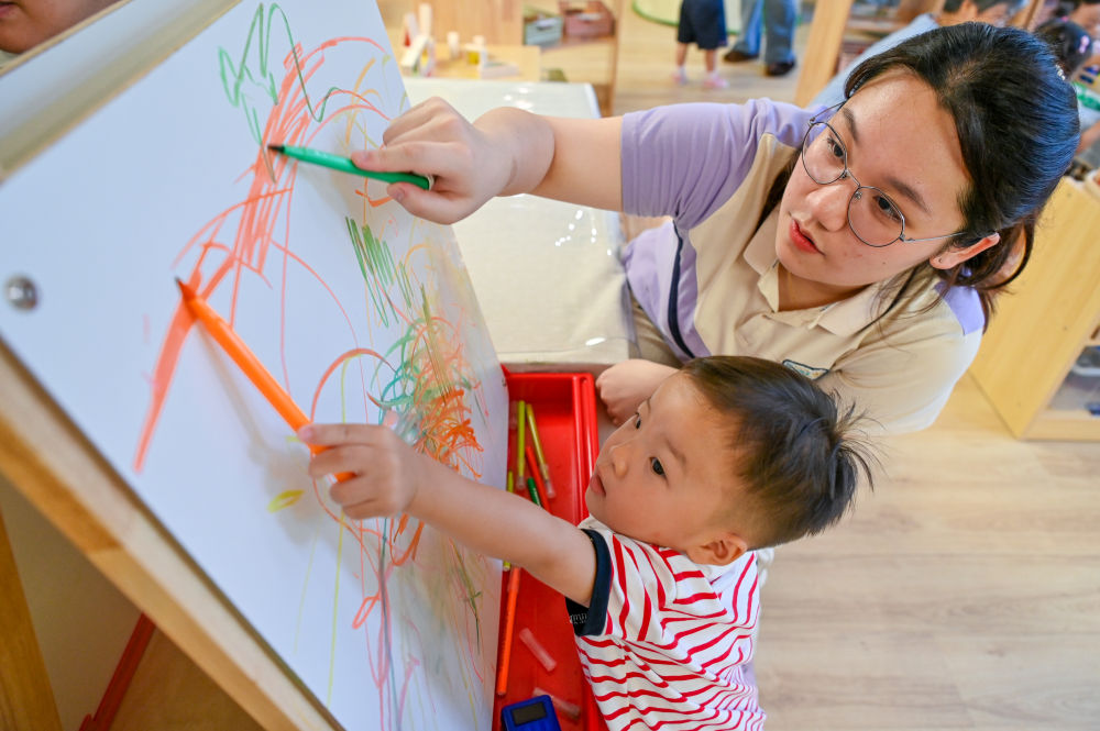 在南京西城晨星晓小禾托育中心,一名小朋友在托育老师的陪伴下画画(2023年9月4日摄)。新华社记者 李博 摄