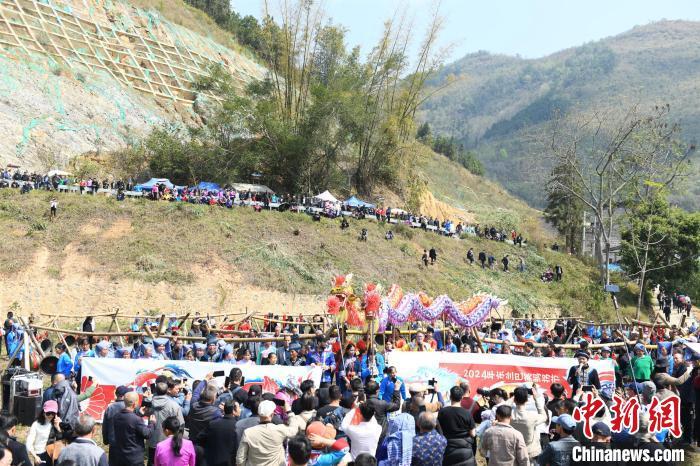 中新社河池3月11日电 题:海内外游客广西河池体验“非遗”盛宴壮族“蚂拐节”