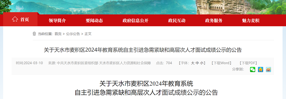 麦积区2024年教育系统自主引进急需紧缺和高层次人才面试成绩公示的公告