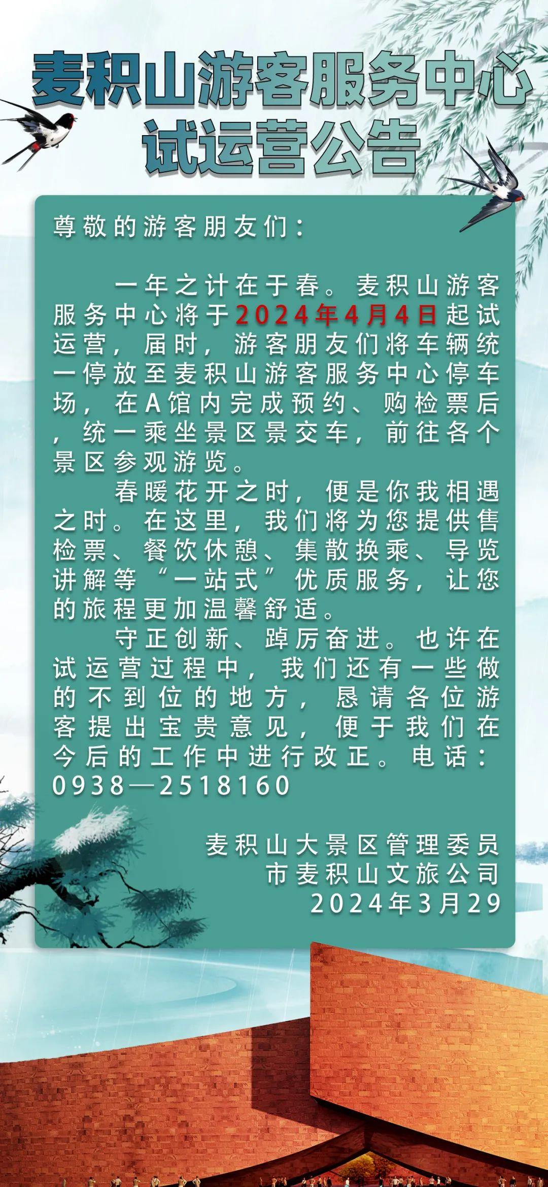 麦积山游客服务中心试运营公告