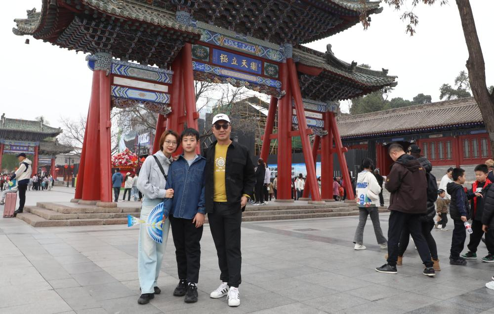 来自南京的崔迎斌一家在天水伏羲庙前合影。新华社记者 张智敏 摄