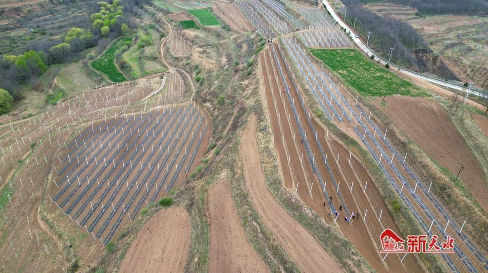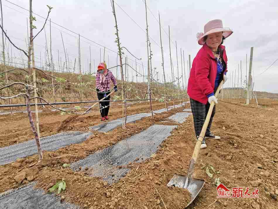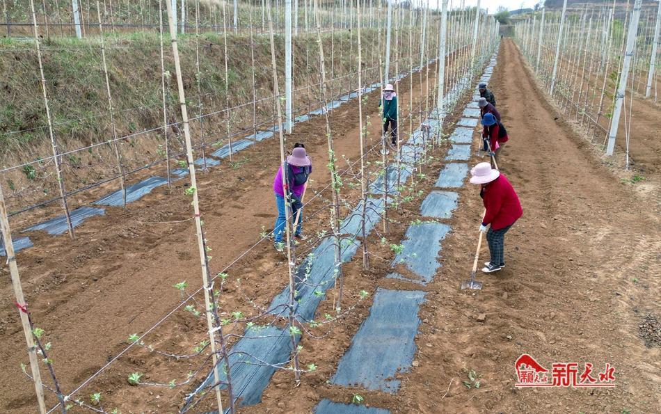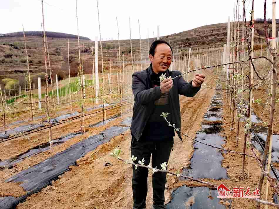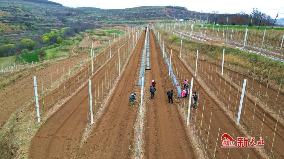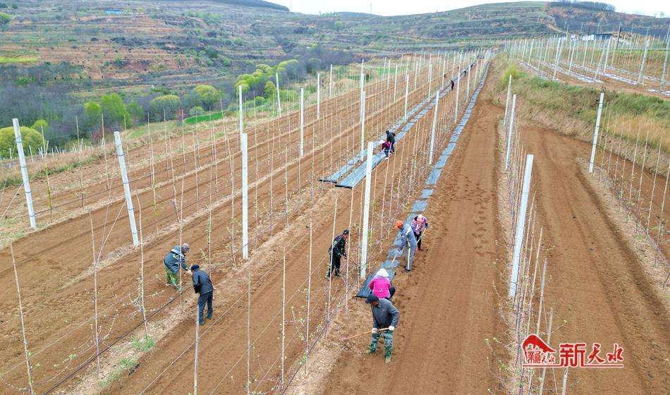 新天水讯 4月9日,在清水县金集镇苹果矮砧密植示范园,果农正在给果树疏花、覆膜,一派繁忙景象。