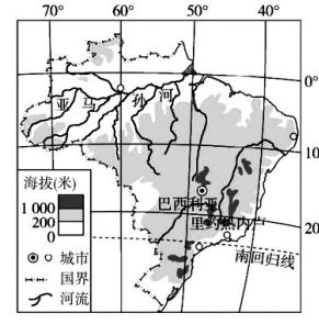 例2(2023年天水会考):南美洲北部的亚马逊平原是世界上最大的平原,这里分布着全球面积最大的热带雨林。热带雨林具有调节全球气候,改善大气等重要作用,但这块雨林正在遭受大肆的砍伐和破坏,保护好这片雨林是全人类共同的责任。右图为巴西简图,据此完成下列问题(10分)