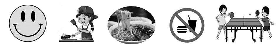 1、听前浏览图片,预测考查点。如大家在做此题时,听前先浏览图片,这时大脑中马上会将图与相关词汇匹配,如:看到图A是张笑脸,对应着单词smile;看到图B是一个学生在做饭,想到短语cook food;图C是一碗面条,对应着a bowl of noodles;图D是一个禁止带饮料及食物的标识,想到祈使句Don’t take food or drinks.看到图E对应着play ping-pong/table-tennis。有了这些预测,就会减少心中的恐慌。