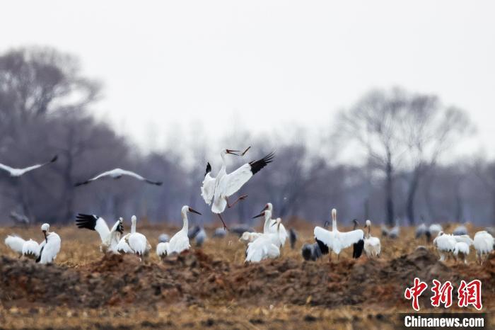 国家一级保护鸟类白鹤在图牧吉国家级自然保护区内翩跹起舞。 毕力格 摄