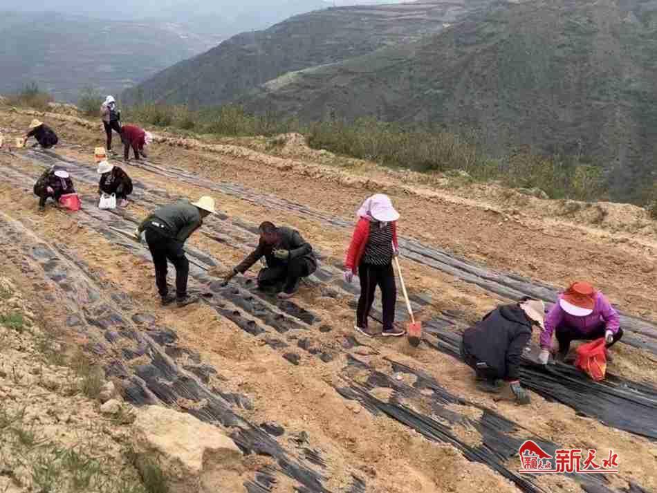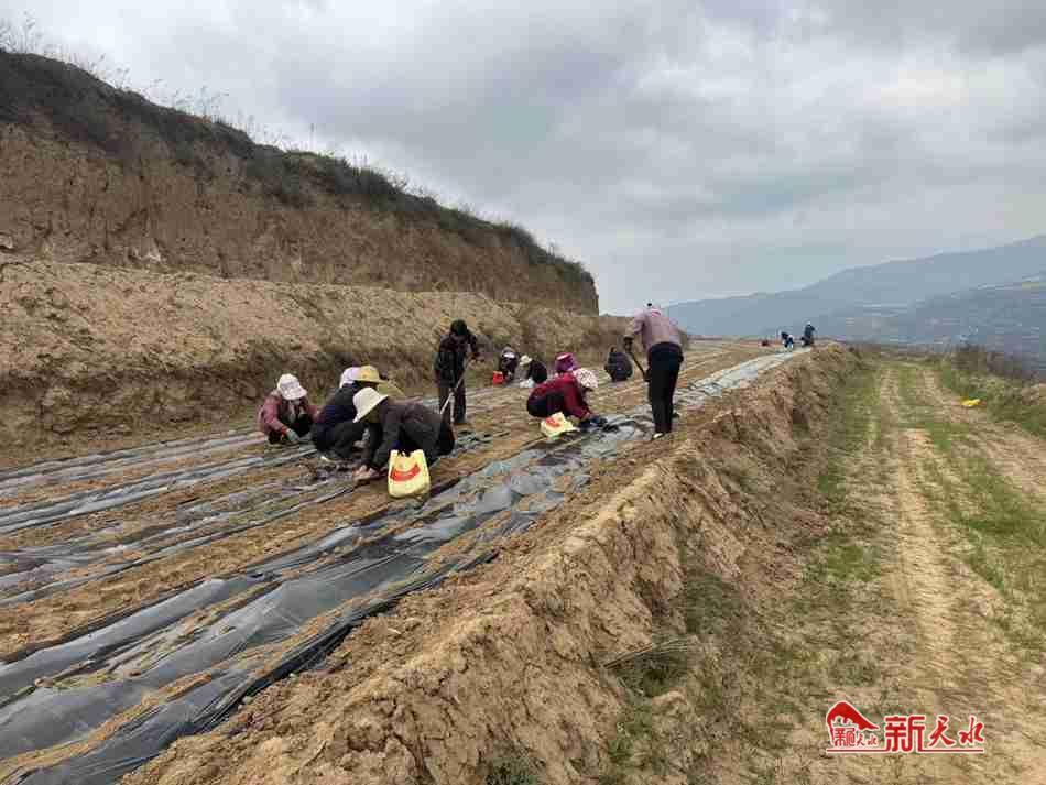 新天水讯 4月29日,在武山县杨河镇西山村的款冬花中药材种植基地,一台台铺膜机缓缓行驶,一排排田垄整齐划一,村民们两两搭档、分工明确,一人挖坑、一人播种,锄落渠开、手起苗种,娴熟的动作加之默契的配合在田间地头呈现出一派繁忙而有序的劳作景象。