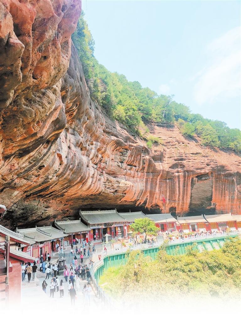 游客在天水仙人崖景区游览。