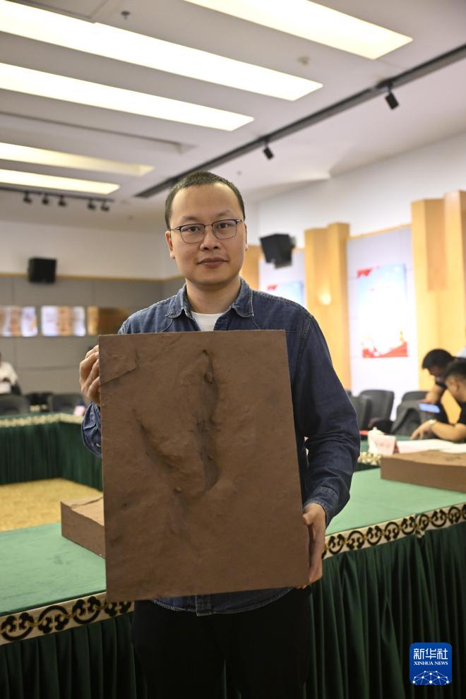 5月6日,中国地质大学(北京)副教授邢立达展示高精度恐爪龙足迹复原模型。新华社记者 李昊泽 摄