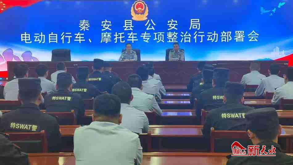 新天水讯 5月6日,秦安县公安局召开电动自行车、摩托车专项整治行动部署会,以进一步提升电动自行车、摩托车驾乘人员的交通安全意识,规范城区电动自行车、摩托车通行秩序,最大限度遏制涉摩、电动自行车道路交通事故多发势头,确保全县道路交通安全形势持续向好。