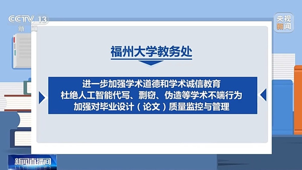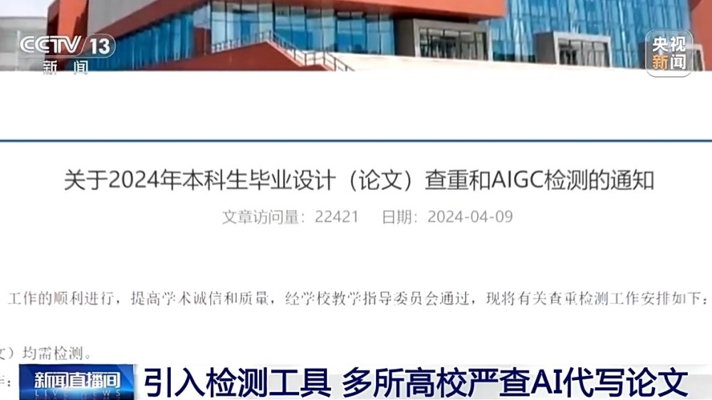 北京教育科学研究院高等教育科学研究所所长 高兵:学生直接用AI生成了论文或者是文章,这个过程是不进行任何思考修改和个性化创作的。如果这种AI代写的现象普遍出现以后,会导致学生的本身的学术能力下降,也会影响学校的声誉。所以在这一方面我觉得学校加强加紧出台相应的政策是也很必要也很及时的。