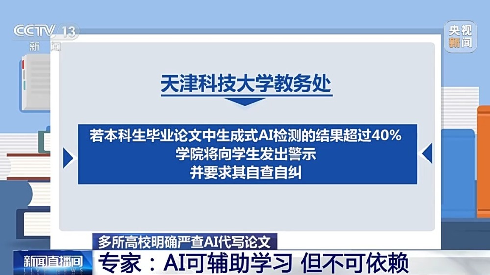 天津科技大学教务处在发布的通知中表示,若本科生毕业论文中生成式AI检测的结果超过40%,学院将向学生发出警示,并要求其自查自纠。