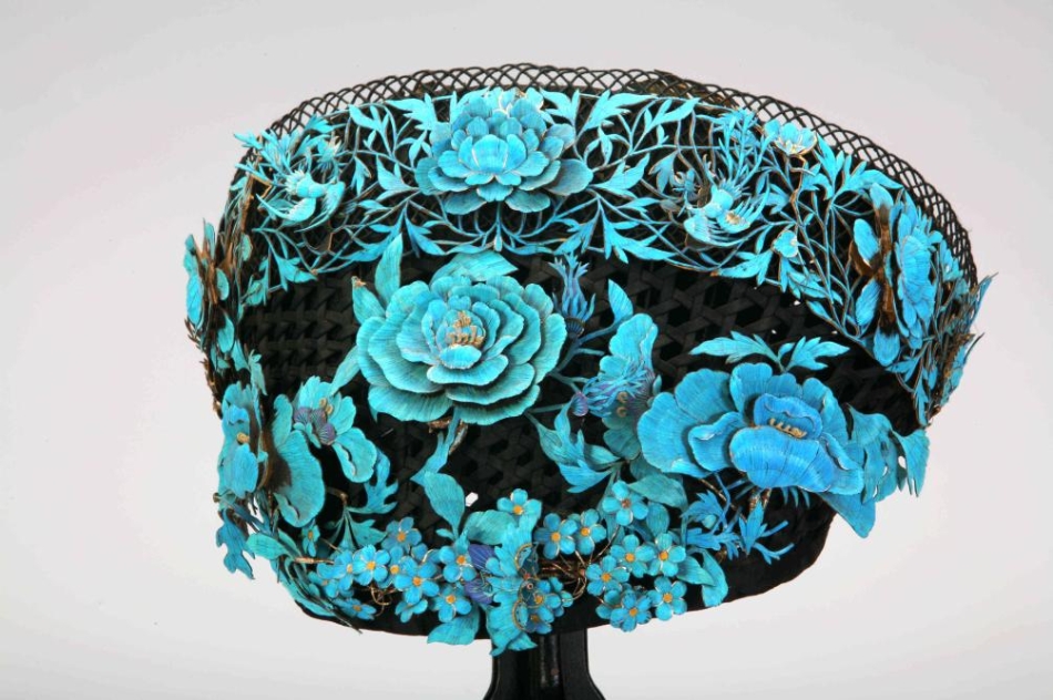 展览中展出的“清黑缎嵌点翠凤戏牡丹女帽”。(沈阳故宫博物院供图)