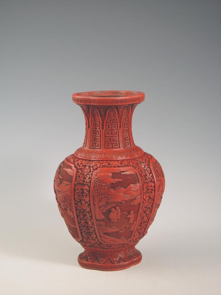 展览中展出的“清剔红勾莲开光山水人物海棠式瓶”。(沈阳故宫博物院供图)