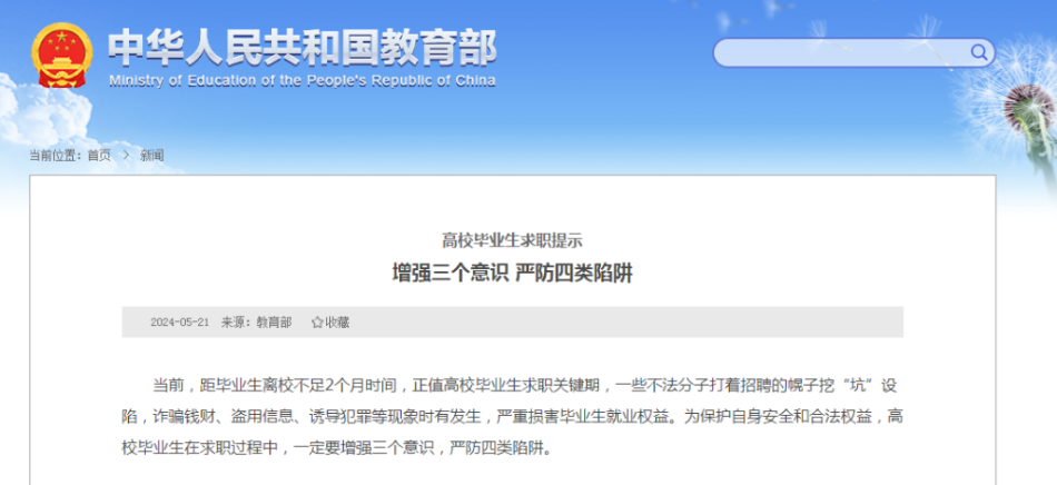 当前正值高校毕业生求职关键期,一些不法分子打着招聘的幌子挖“坑”设陷,诈骗钱财、盗用信息、诱导犯罪等现象时有发生,严重损害毕业生就业权益。教育部5月21日提示高校毕业生,严防非法职业中介陷阱、严防招聘收费陷阱、严防招聘诈骗陷阱、严防“猫腻”合同陷阱。