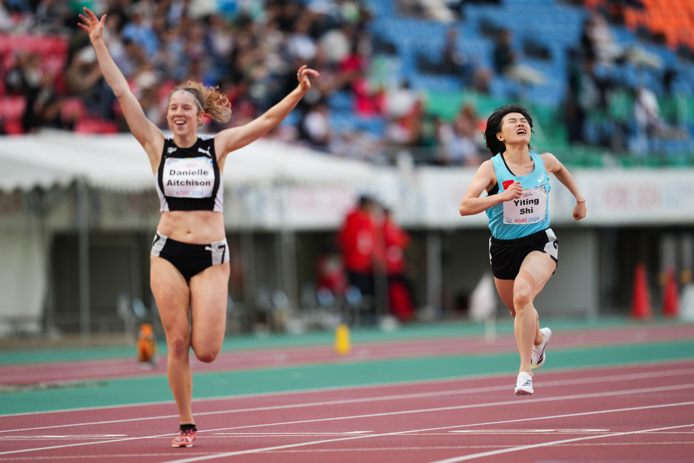 5月23日,中国选手史逸婷(右)和新西兰选手丹妮尔·艾奇逊在女子200米T36级别决赛中。新华社记者 张笑宇 摄