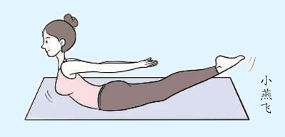 平卧在床上(床不要太软),头颈部后伸,双上肢向背后伸直稍用力抬起,胸部离开床面,双下肢伸直从床上抬起,以胸腹部为支撑点。