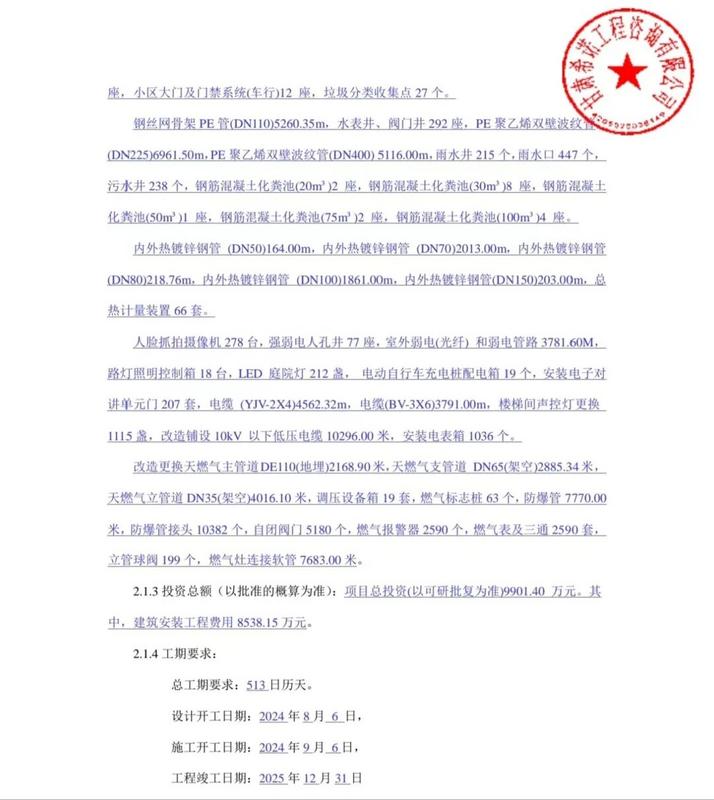 项目总投资9901.40万元(以可研批复为准)。其中,建筑安装工程费用8538.15万元。总工期要求513日历天。设计开工日期为2024年8月6日,施工开工日期为2024年9月6日,工程竣工日期为2025年12月31日。