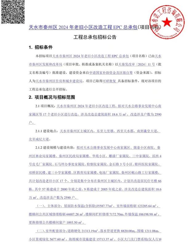 2024年7月11日,天水市公共资源交易中心发布“天水市秦州区2024年老旧小区改造工程EPC总承包工程总承包招标公告”。项目已由秦州区发展和改革局批准建设,建设资金来自申请国家补助资金及区级自筹,招标人为天水市秦州区住房和城乡建设局。
