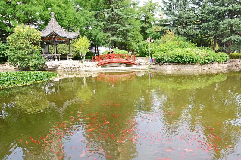 人民公园里鱼翔浅底、锦鳞游泳,市民结伴游园。