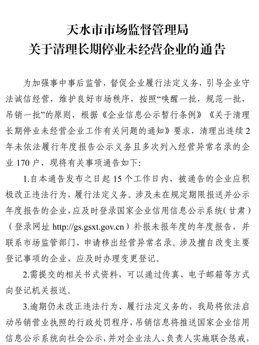 天水市市场监督管理局关于清理长期停业未经营企业的通告