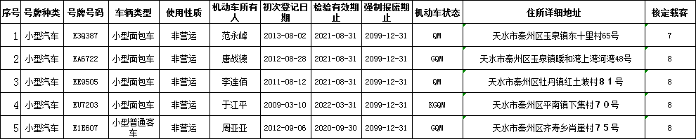 为了彻底消除隐患,维护道路交通秩序,预防和减少道路交通事故,保护公民生命财产安全及其他合法权益,提高道路通行效率,根据《机动车登记规定》第四十一条之规定,拟对逾期未检验达到报废标准的车辆公告其机动车登记证书、车辆号牌、行驶证作废,请车辆所有人于公告之日起15日内前往秦州公安分局郊区交通警察大队车辆管理所办理注销登记,逾期未办理的,秦州公安分局郊区交通警察大队车辆管理所将强制注销,现将车辆基本信息公示如下。