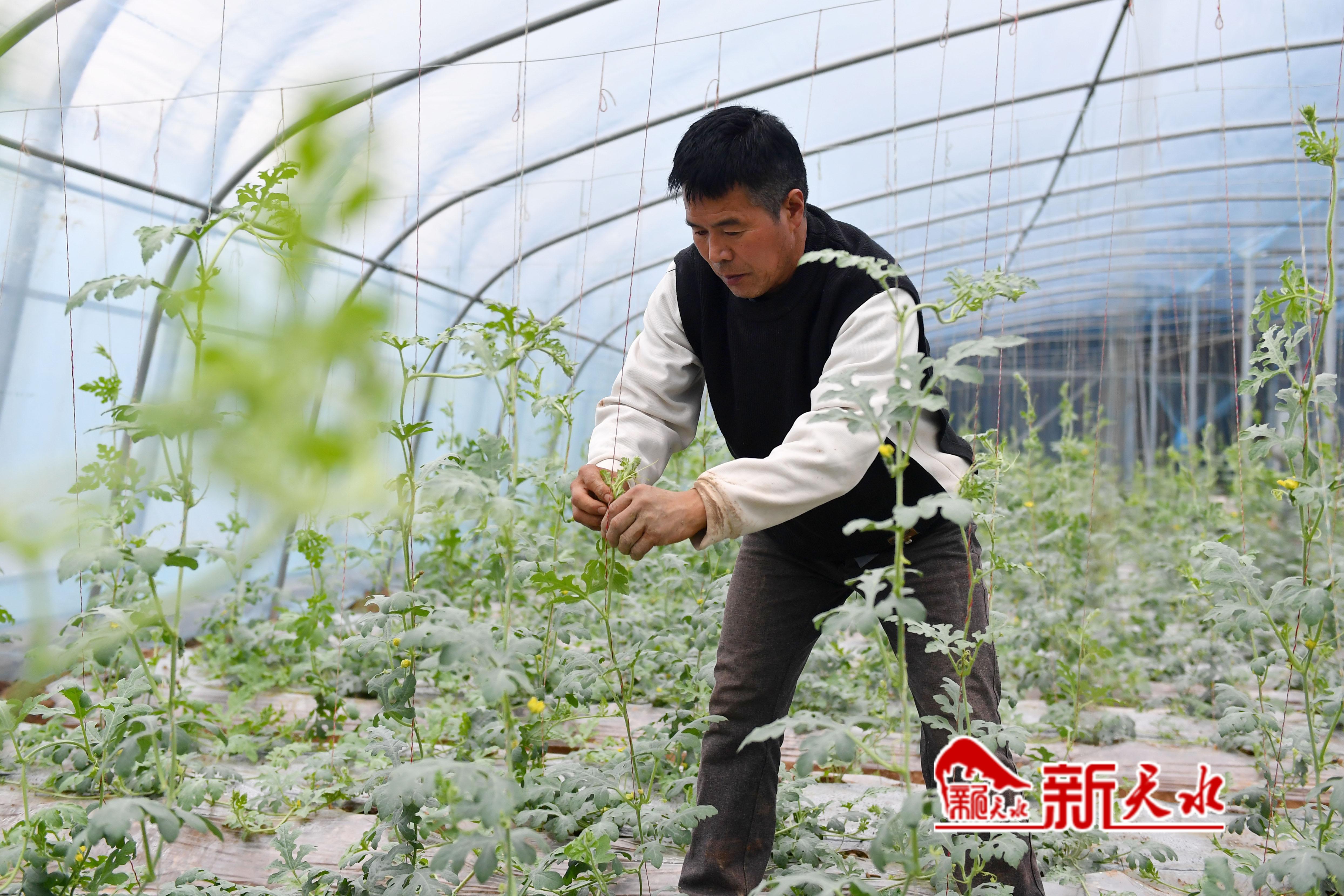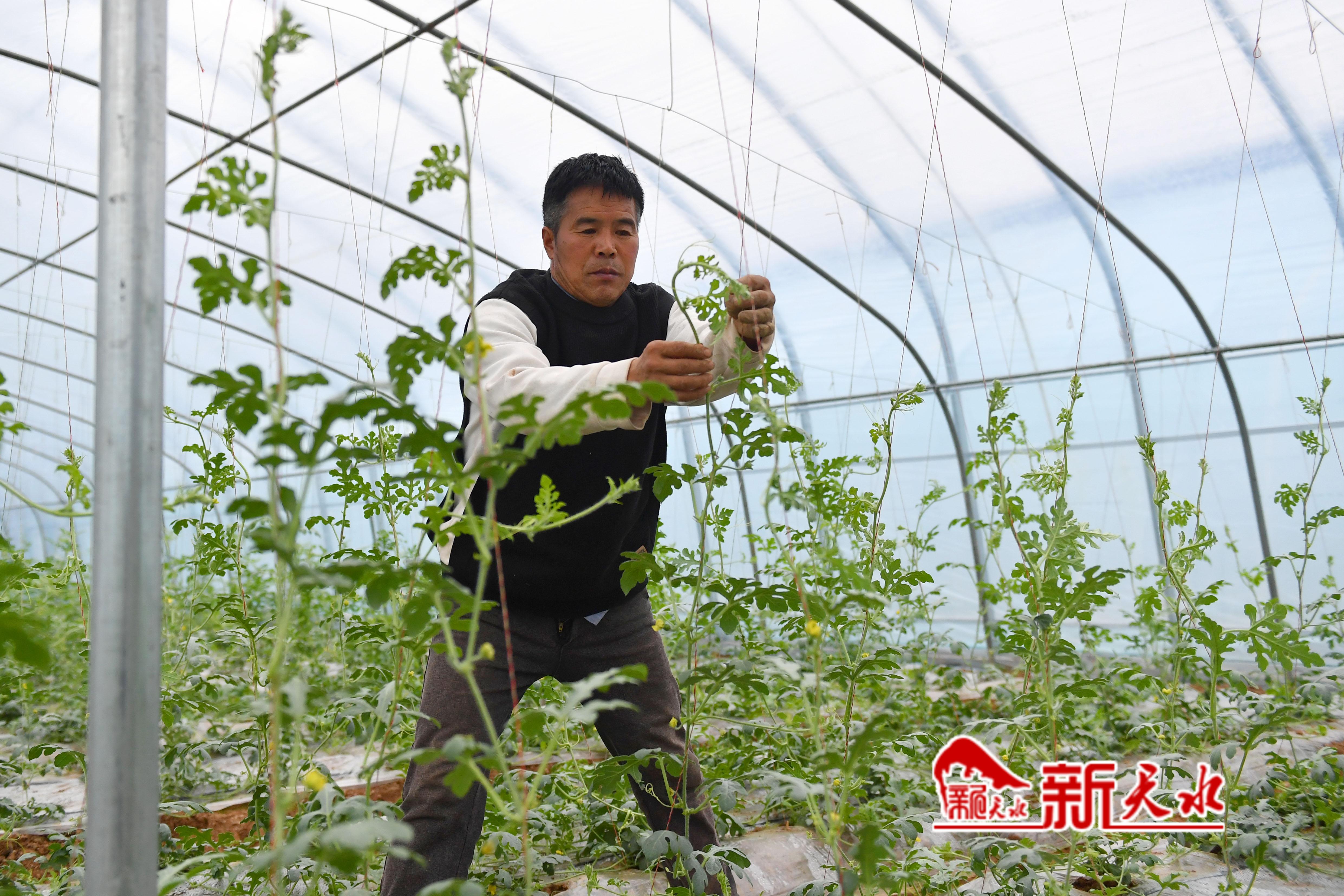2月25日,在武山县山丹镇周庄村现代设施农业产业园的西瓜大棚里,瓜农正忙着给西瓜吊蔓掐尖,为增产增收打下坚实基础。