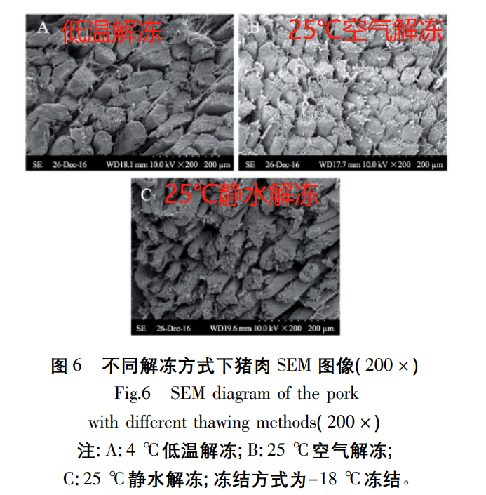 一篇发表在《食品工业科技》上的文献显示,研究人员用实验对比了不同解冻方式对猪肉品质的影响,包括 25℃ 室温解冻、25℃ 静水解冻、4℃ 低温解冻。结果表明 4℃ 低温解冻虽然比较慢,但不仅能降低细菌的繁殖,还能抑制脂肪的氧化。较慢的解冻还可让肉类中的水分有充分的时间渗透迁移到组织之中,尽量维持饱满的状态,能够较好的保持肉类品质。