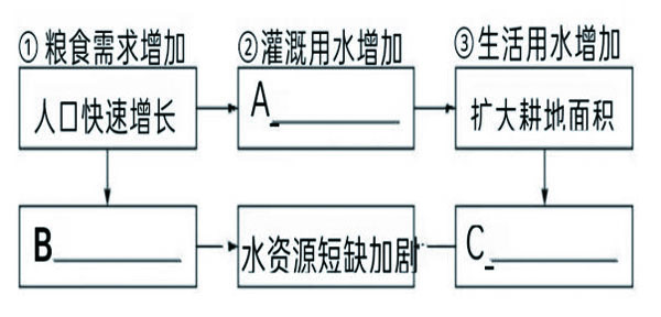 (2)请将上面右图内容的序号填入对应的空格内,完成“中亚人口快速增长与水资源短缺加剧关系”的框图。(3分)