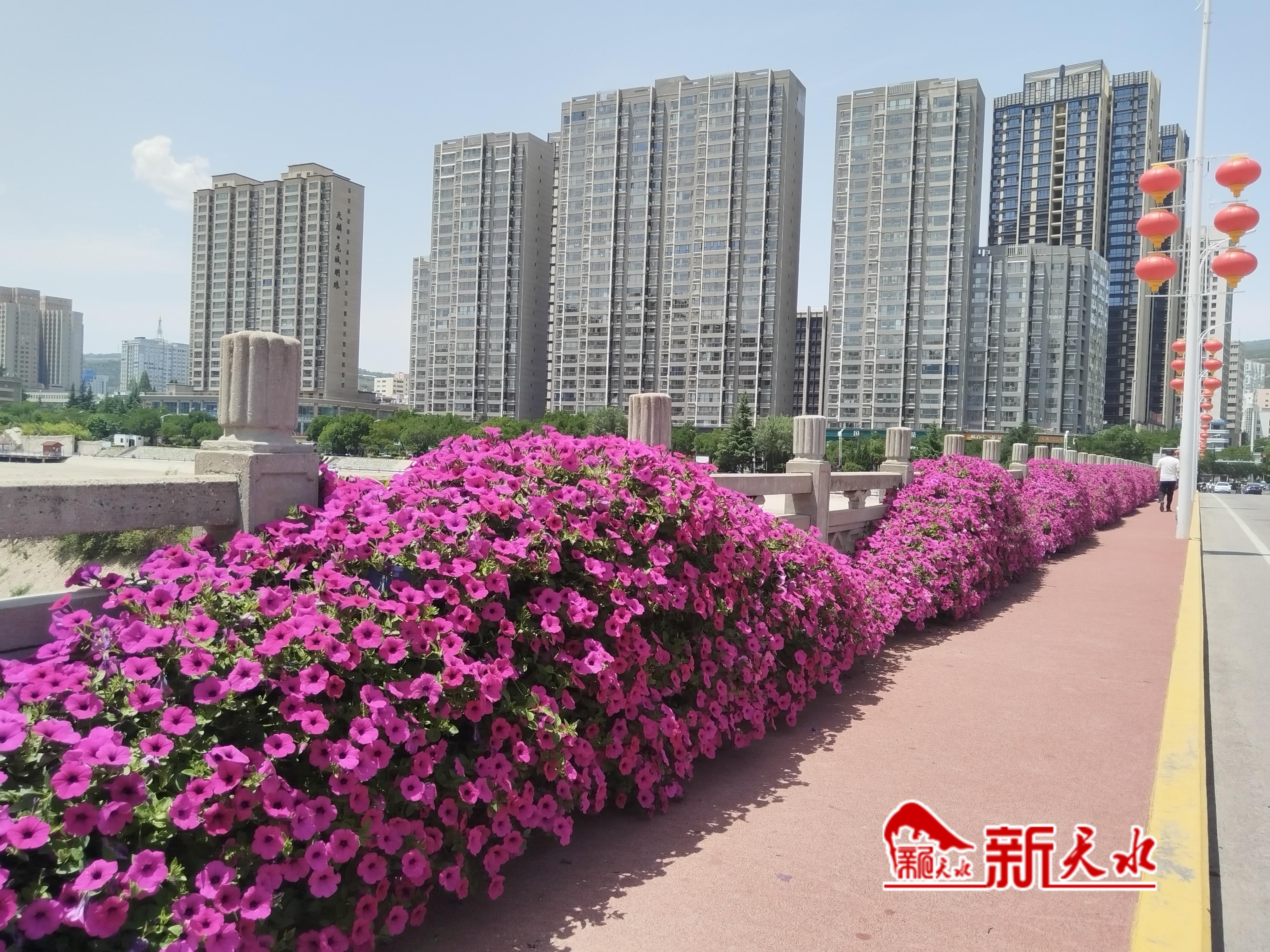 6月9日,记者在秦州区龙城广场看到,秦州区园林建设服务中心正组织人员在主题绿雕周围摆放鲜花,大家分工明确,你搬运、我摆放,没过多长时间,3辆车上的鲜花就已经搬运、摆放完毕。在民主路、迎宾大桥、藉滨大桥等地记者看到,已经摆放的朵朵鲜花竞相绽放,在夏日的习习微风中轻轻摇曳,把城市街景装扮得格外靓丽。