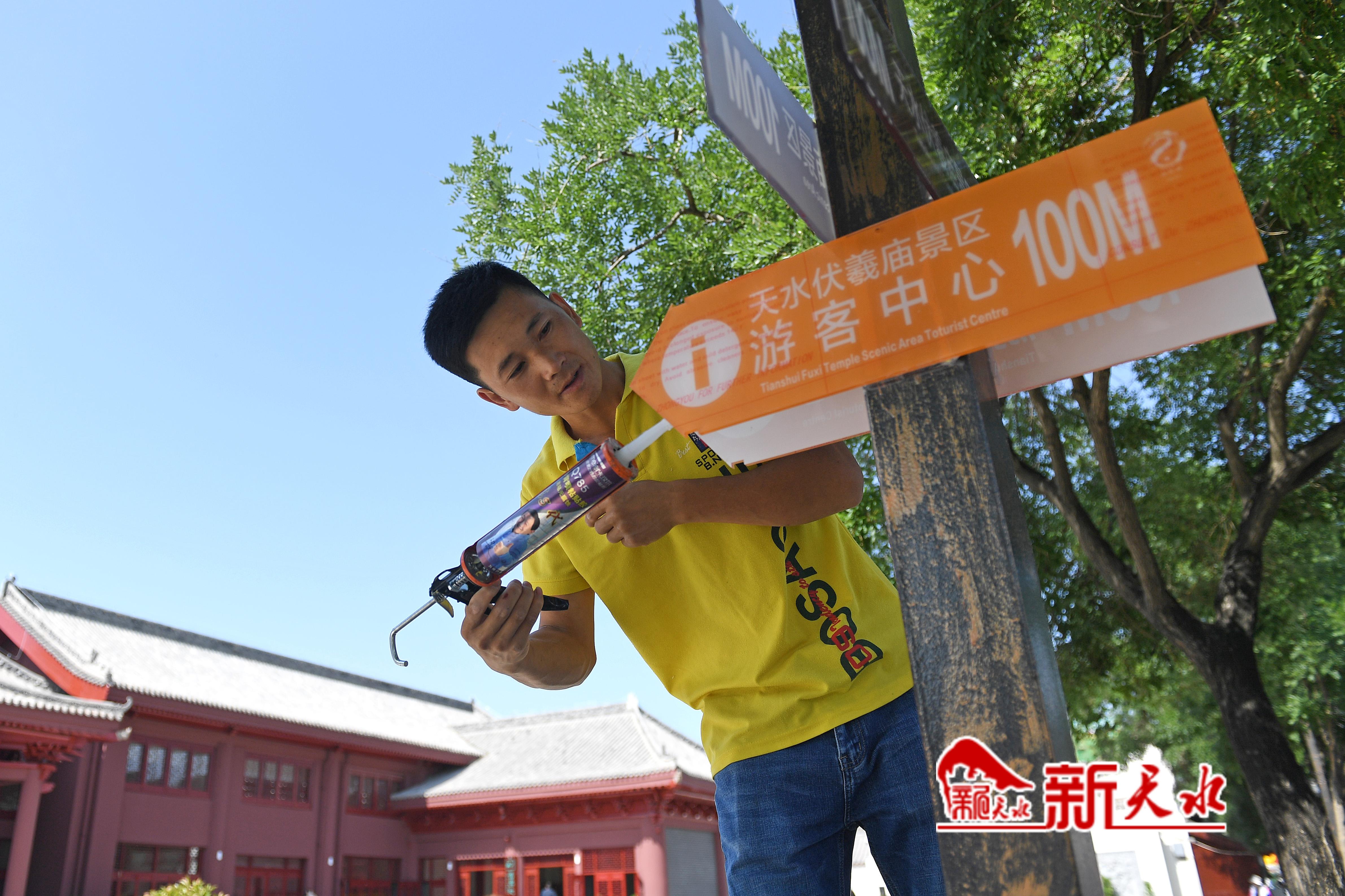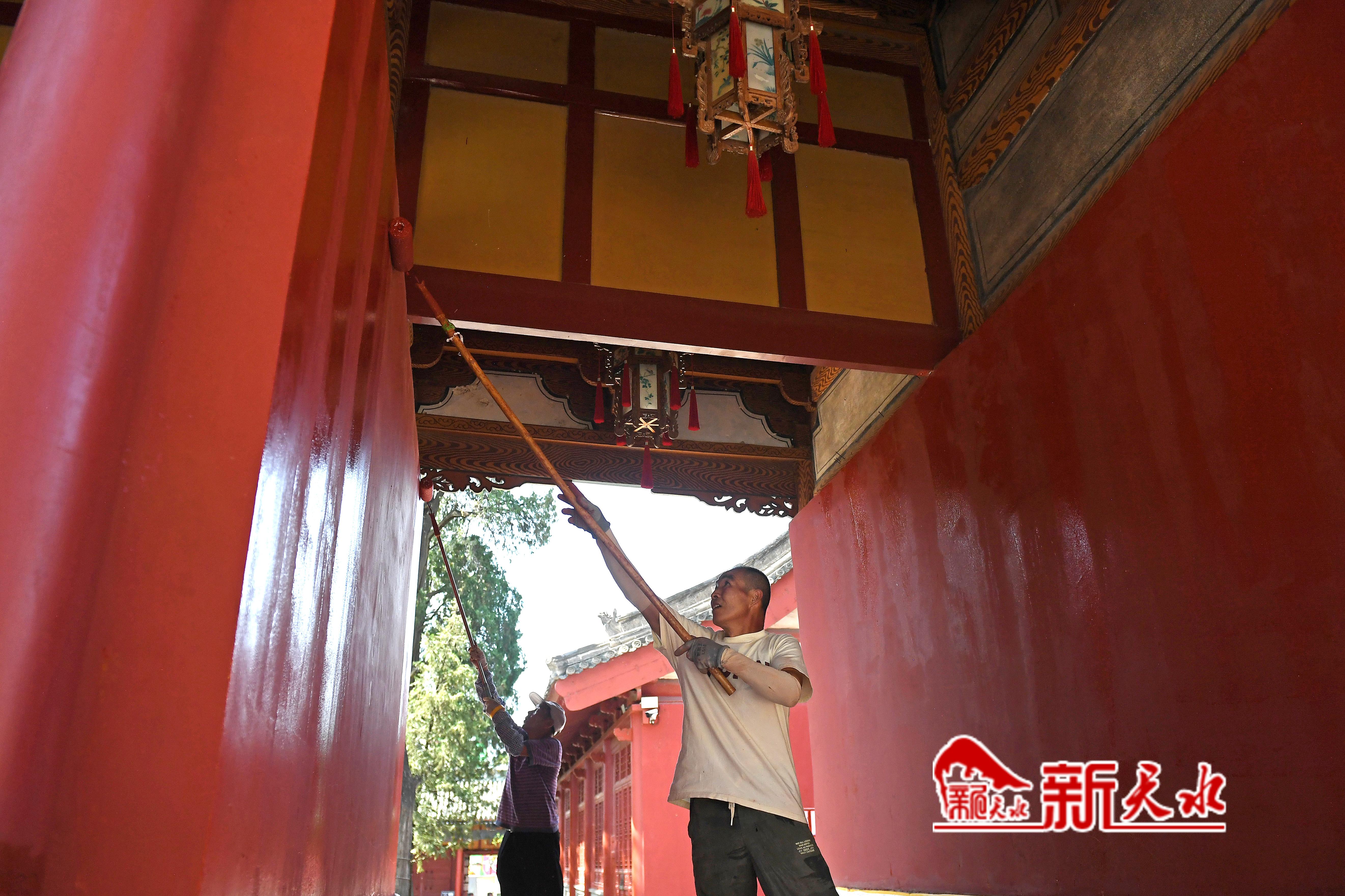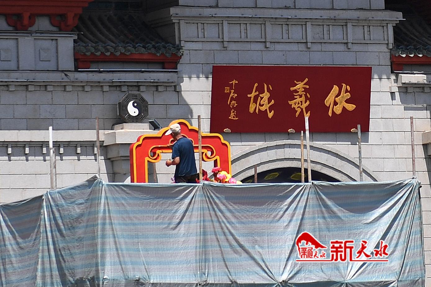 天水伏羲城、伏羲庙内一派繁忙景象:环卫工清洗地面,油漆工粉刷墙面和大型花篮,安装工人设置景区指示牌、布置花篮。